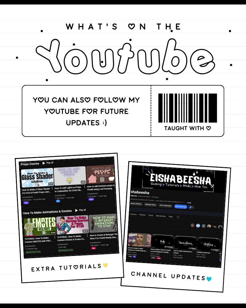 Our curated collection of high-quality mods is designed to bring creativity and immersion to your gaming world. Beyond mods, I offer expert mentoring and in-depth courses to teach you how to create custom clothing, props, and more for GTAV and FiveM. Whether you’re a beginner or an experienced modder, I provide the tools and knowledge to help you succeed.